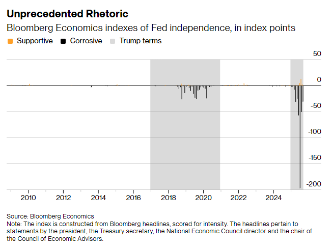 本年通盘夏令,特朗普对鲍威尔的抨击合手续升级,一项统计行政部门挫折好意思联储寂寞性的指数在7月创下历史新高。
