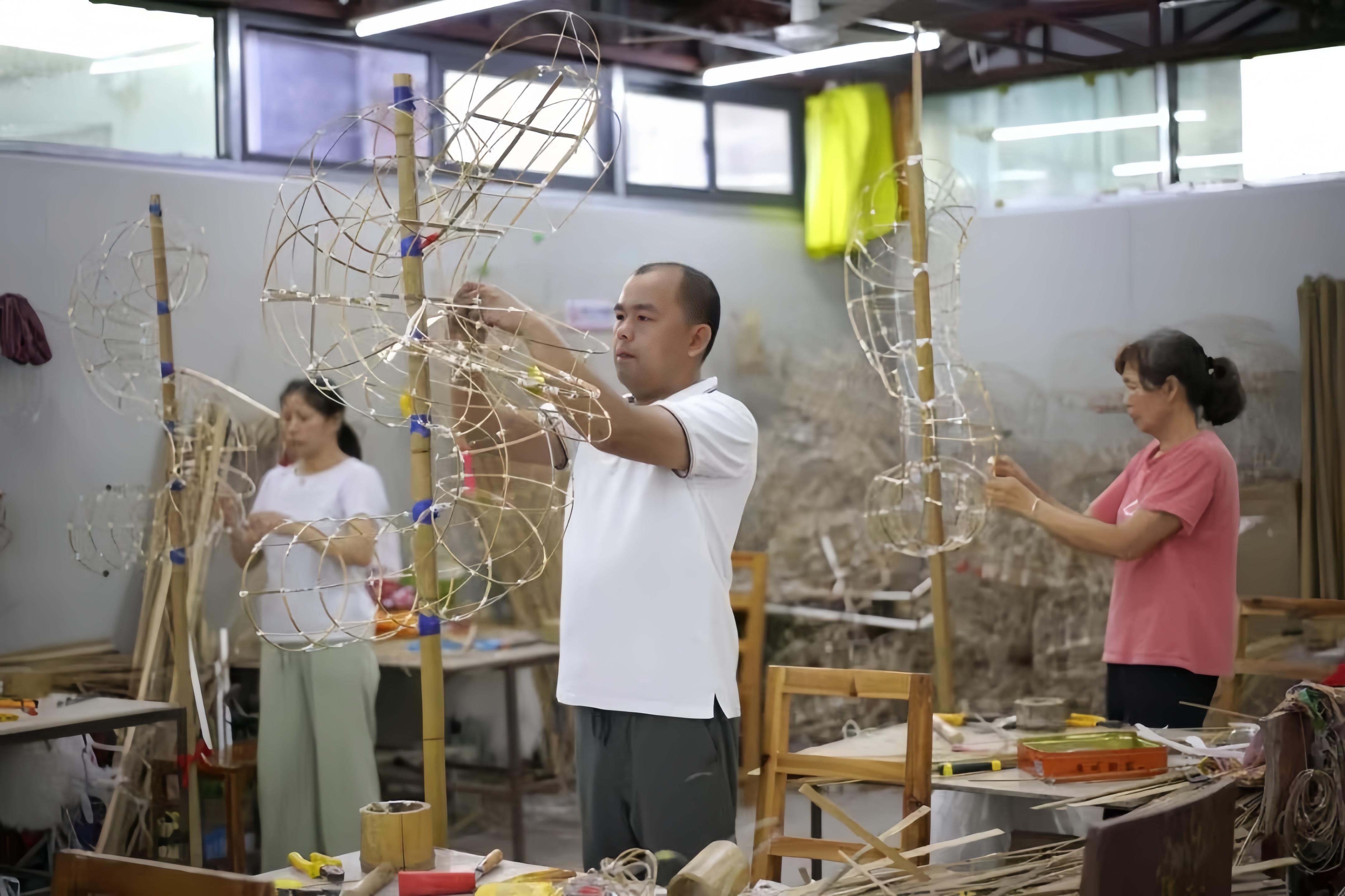 叶竞循先容,彩扎狮头本事共有四谈工序,别离为扎作、扑布、绘饰、装狮。“扎作”指的是用精选加工过的竹篾、藤条、铁线、纱纸扎制头胚。扎一个完满的狮头需要一千多条竹篾,扎千余至三千多个节点。